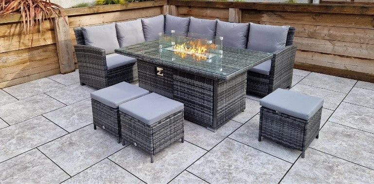 Carlton Outdoor Rattan Corner Rising Fire Pit Dining Set Light Grey/Beige New